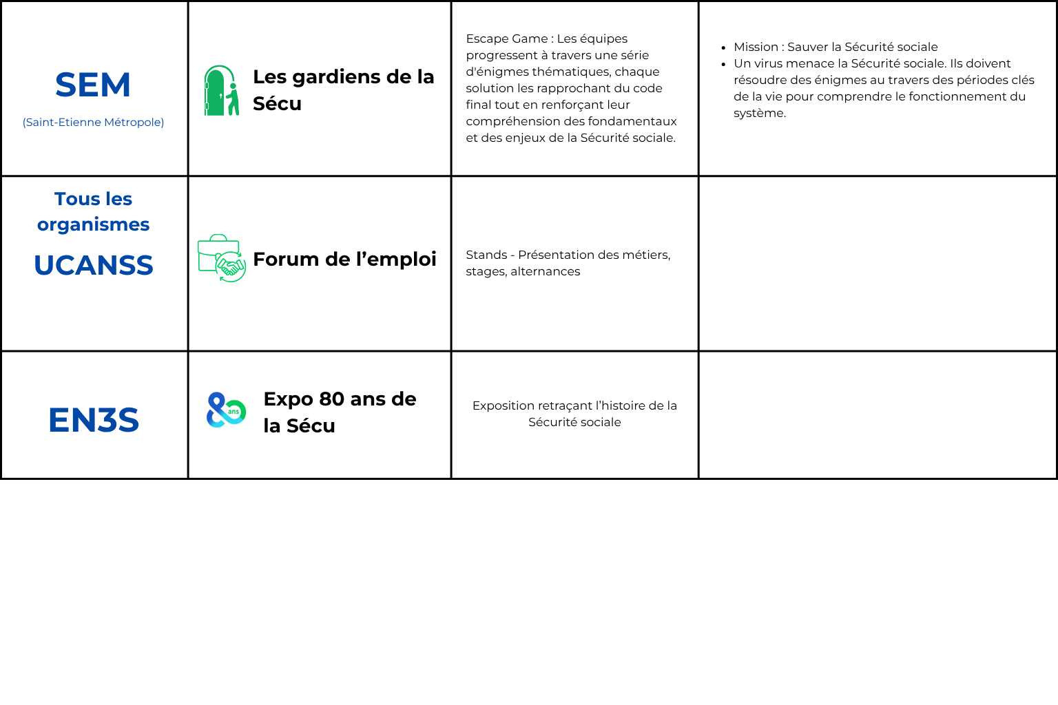 Vous pourrez découvrir un forum de l’emploi, participer à un escape game proposé par Saint-Étienne Métropole et visiter une exposition dédiée aux 80 ans de la Sécurité sociale.